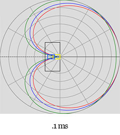 Shown left is a cardioid style stack. The one pictured has four cabinets but cardioid may be achieved with three with any one cabinet reversed. The spl level from the driver would have to be matched to the output of the forward facing pair. The vertical spacing of the foward facing pair will impact on the upper usable frequency limit.